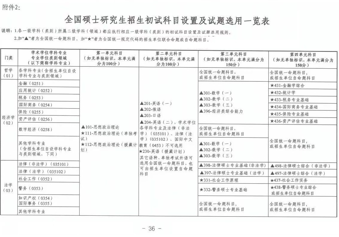 注:1.加“▲”者为全国统一命题科目。加“★”者为全国统一规定代码的招生单位联合命题或自命题科目。