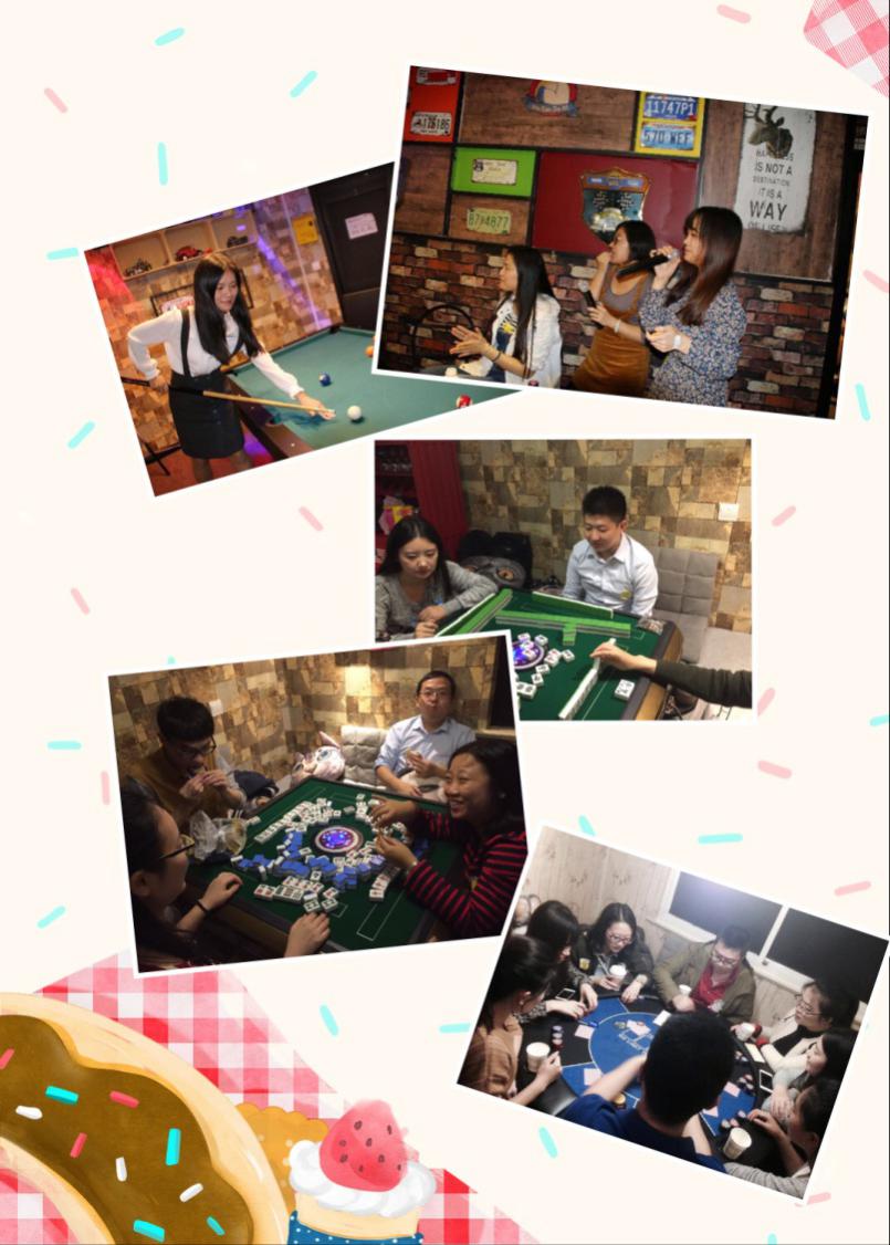 简单的午餐过后,大家纷纷聚集起来开始组团进行丰富多彩的娱乐活动。轰趴馆分为四个主题房间。第一间房有桌游、电玩等。第二间房间是德州扑克桌,第三间房是KTV和桌游。第四间房有麻将桌和小霸王游戏机。各种娱乐设施,一应俱全,满足了同学们不同的爱好。这边歌声嘹亮,那边噼里啪啦砌长城;这边德州扑克桌上赢筹码,那边台球场上又进球。过道上还有同学聊天,吃零食,好不热闹。
